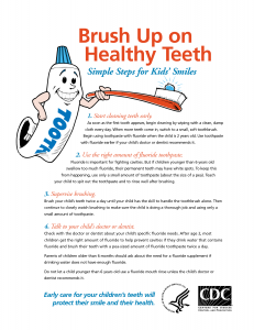 As soon as the first tooth appears, begin cleaning by wiping with a clean, damp cloth every day. When more teeth come in, switch to a small, soft toothbrush. Begin using toothpaste with fluoride when the child is 2 years old. Use toothpaste with fluoride earlier if your child’s doctor or dentist recommends it.